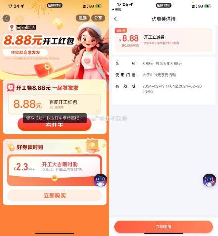 【百度打车开工领8.88亓打车券】打开活动地址->跳转到百度地图APP->直接领8.88亓百度打车券