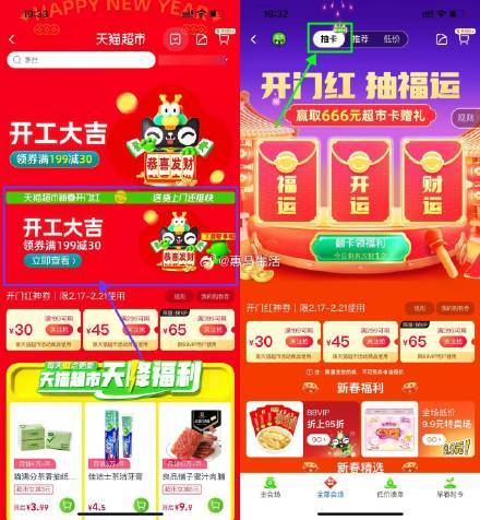 【天猫超市抽最高666元猫超卡】淘宝打开活动->点“开工大吉”->顶部“抽卡”每天翻牌抽最高666亓天猫超市卡