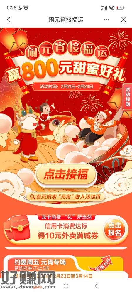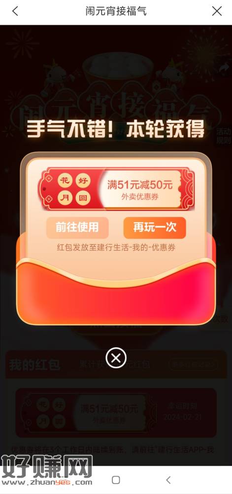 建行生活新活动,刚中51减50外卖券,建行生活-热门活动-闹元宵接福运。