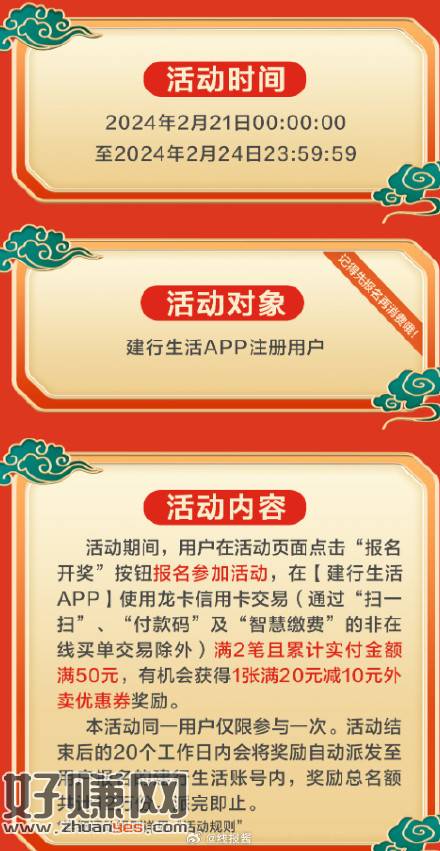 报名后,建行生活付款码用建行信用卡付两笔50,领外卖20-10券