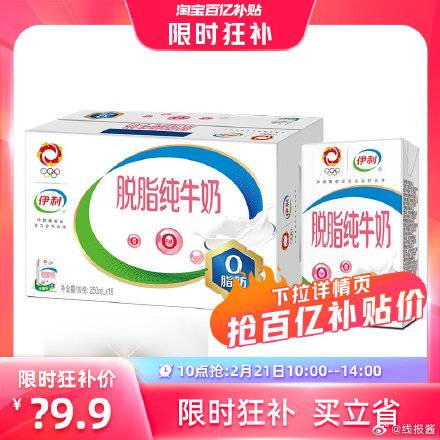 伊利脱脂纯牛奶250ml*16盒