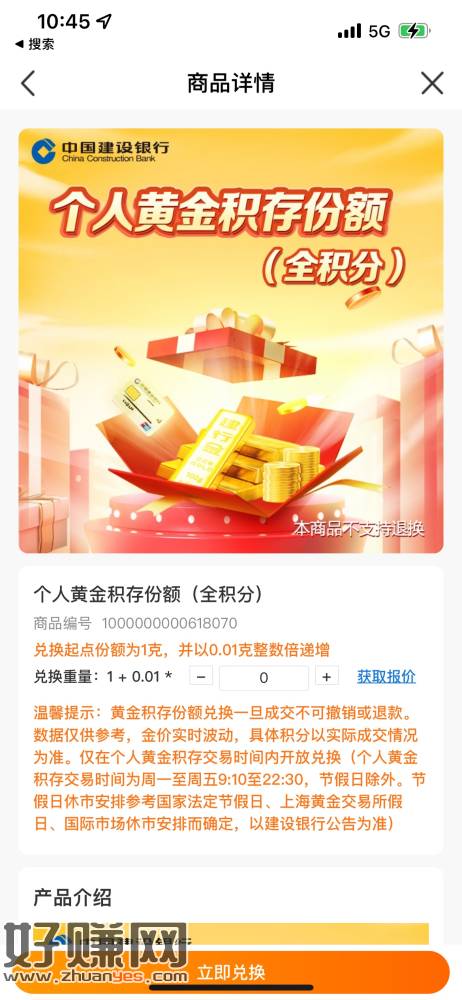建行全积分兑换黄金!兑换比例700:1