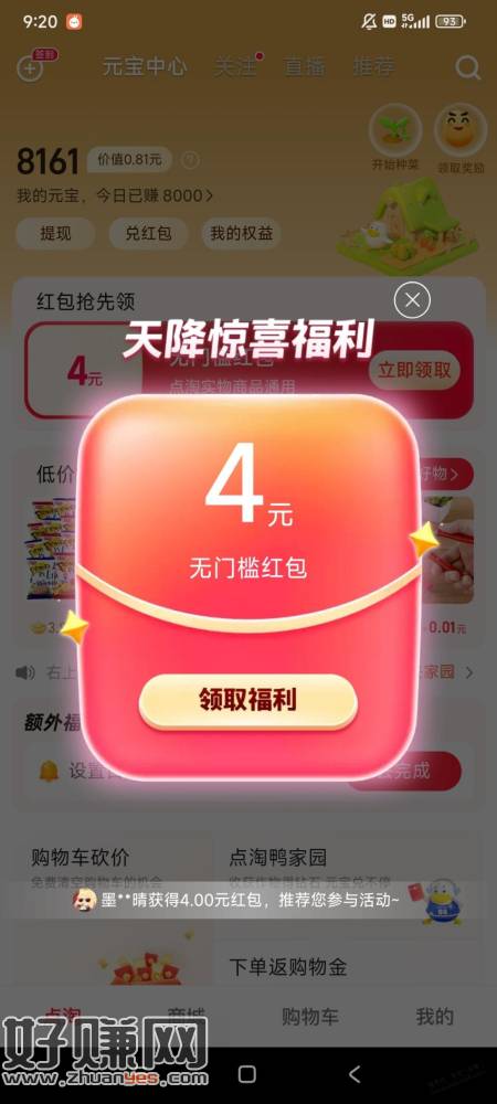 点淘app,1个月没登陆过的,上去看看,首页元宝中心,可以领取4无门槛红包,全点淘通用,自己选东西买,推荐抽纸,自己搜索