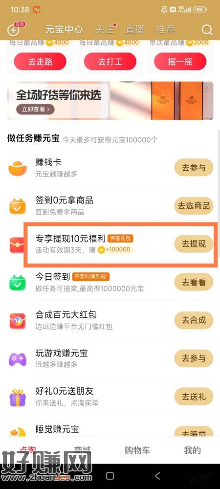 元宝中心往下拉,部分用户有专项提现10元任务,点进去,很容易提现