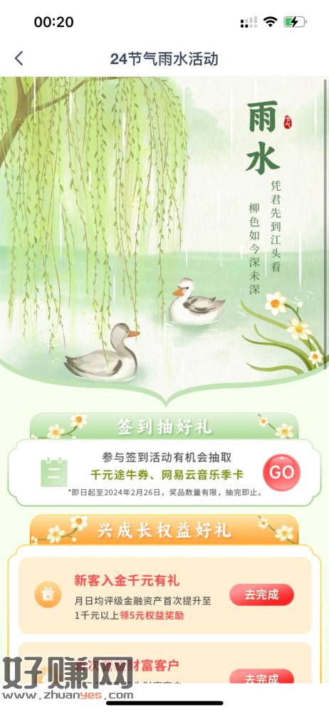 兴业银行热门活动,雨水,签到三天抽奖,刚中网易云季卡,26日