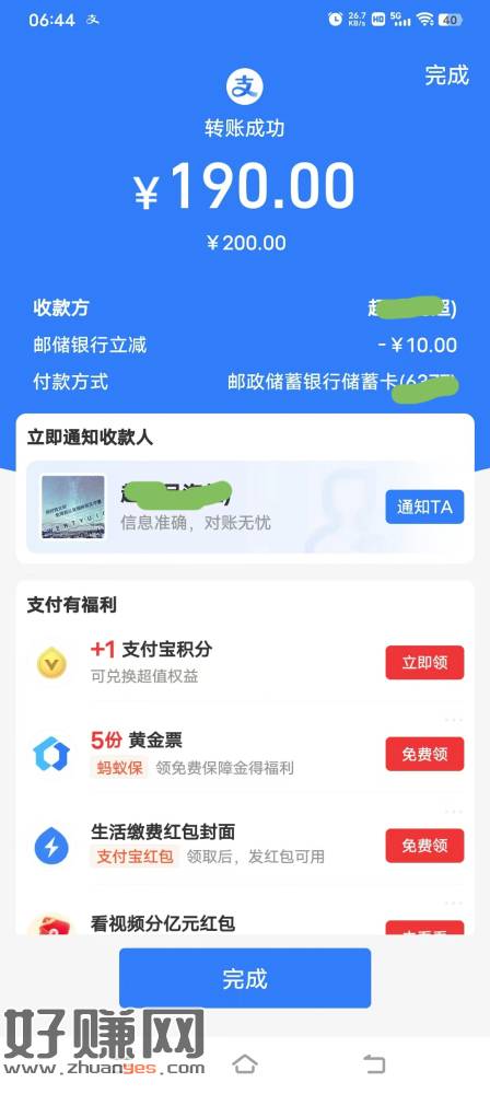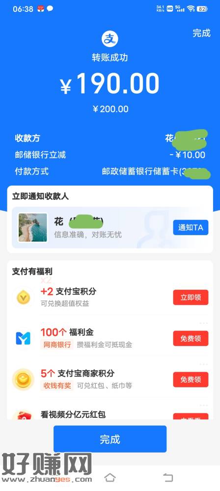 支付宝邮政转账200-10,不知道限不限地区,这是广东的