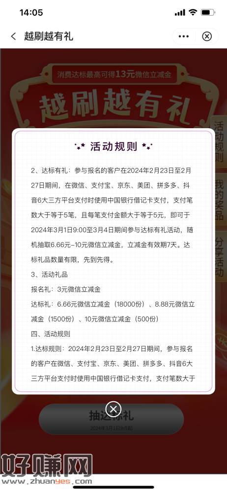 中行苏州报名3毛,刷5笔5元以上再抽6.66~10