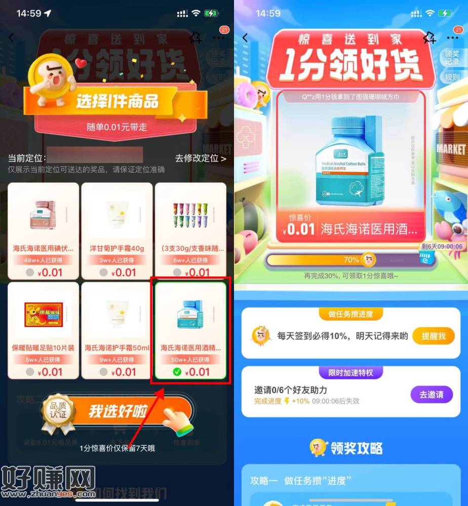 【饿了么签到3天0.01领实物包邮】新一期!饿了么APP搜索“一分惊喜”->选择“酒精棉球”(这个不用运费,其他都要运费)->签到3天支付0.01元包邮到手