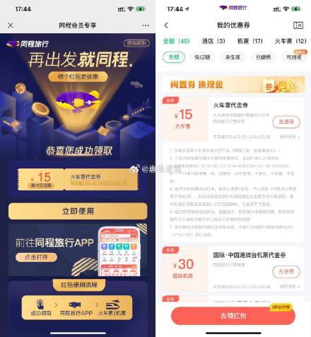 【同程旅行领16减15元火车票券】新一期!打开活动地址->登陆后直接领16-15元火车票券,券有效期到3月8日