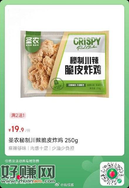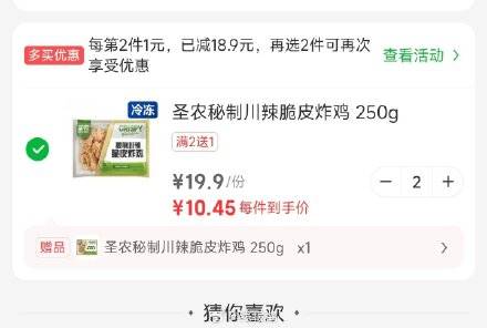 叮咚买菜这个炸鸡第二件1元,叠加买2送1,买2件到