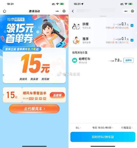 【哈啰出行领15元顺风车立减券】微信打开地址->自动领15亓顺风车券->券有效期15天
