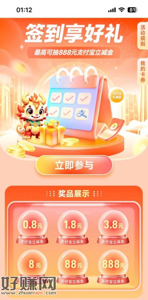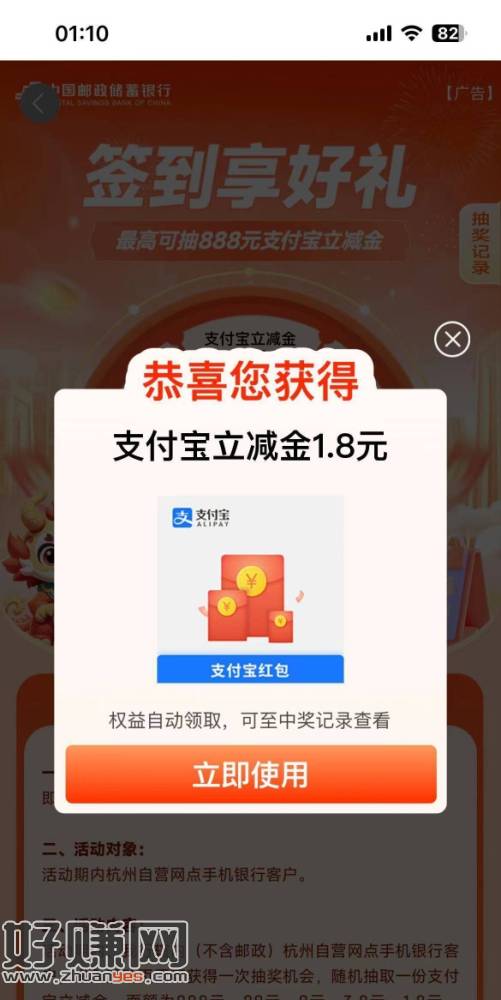 邮储杭州 活动中心 签到享好礼 最高888支付宝立减金 试了