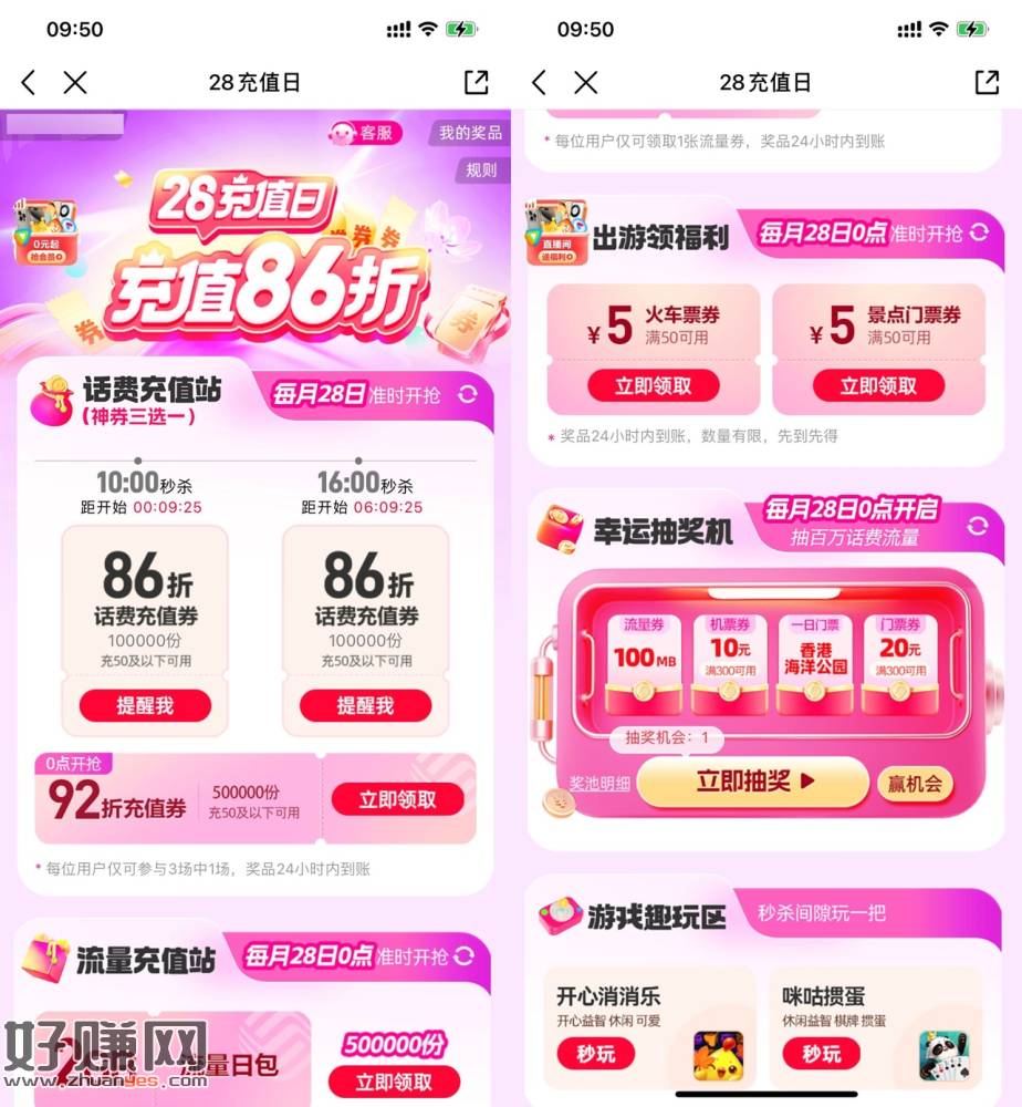 【移动用户准点抢86折话费充值券】10点场即将开抢!中国移动APP搜索“28充值日”->10点、16点抢86折话费券,共限量20万份