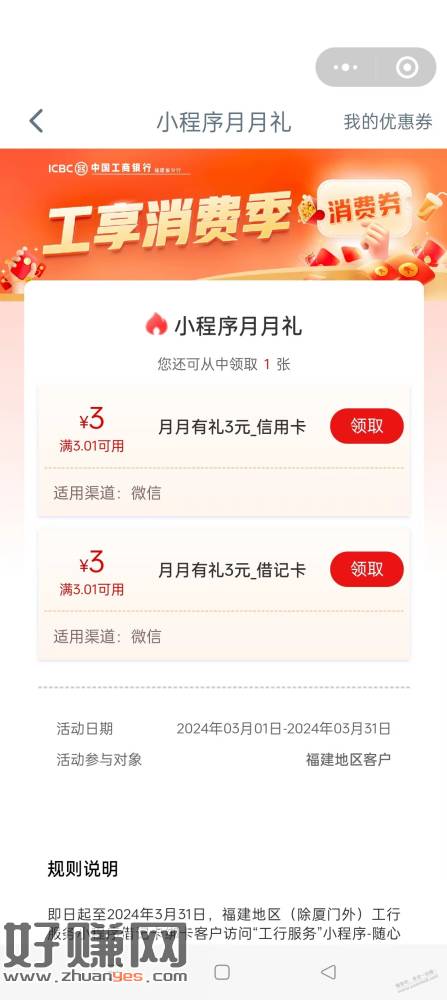 工行福建(厦门除外)3元立减金!