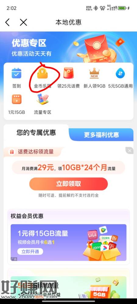 缺流量的可以去抽,如图本地优惠-金币乐园-至高抽100G流量