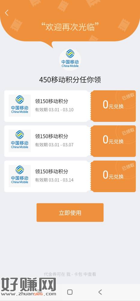 中国移动app,选自定义充1元话费,充值成功后在页面下方领取450积分。