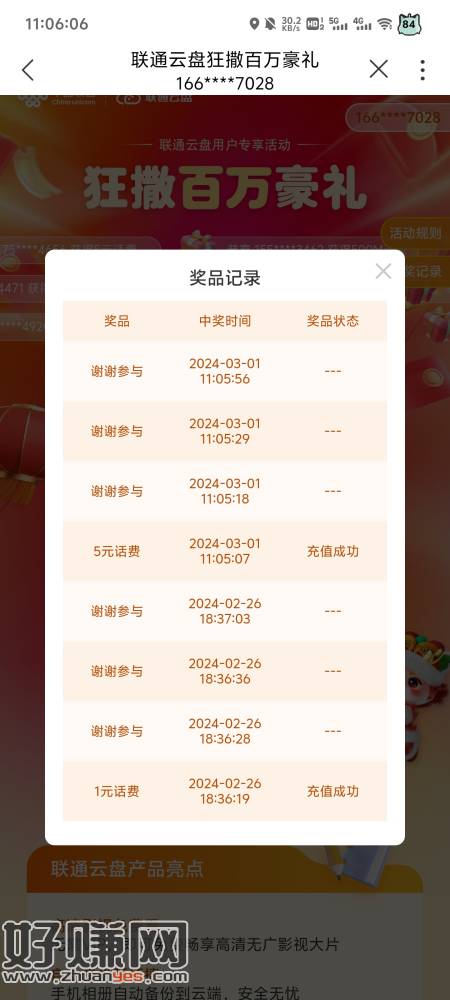 新的一个月联通app搜云盘,进去横幅抽奖。副号小号也可以参加