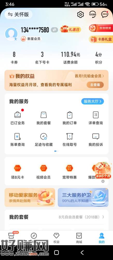 中国移动app,我的,右上,礼遇日