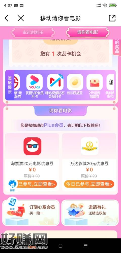 移动铂金puls会员,在移动app权益领20淘票票票。。。现在还有