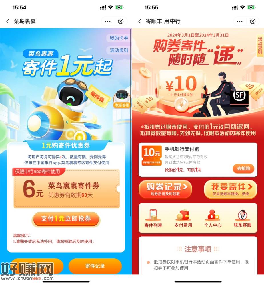 新一期!中国银行APP->分别搜索“菜鸟”和“顺丰”->菜鸟1元买6元寄件券,顺丰1元买10元寄件券,刚好要寄快递的上吧!