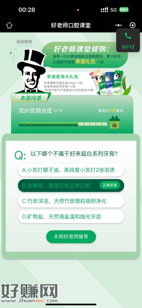 微信打开地址->每周1一道题目,连续答对15周领黑人牙膏礼包