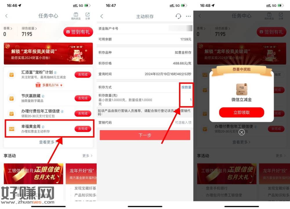 【工行幸福黄金周抽10元立减金】工行APP搜索“任务中心”->如果有“幸福黄金周”且显示“如意金积存”(如果显示的是“积存金”就别参与了)就选择“按数量”积存1g,然后抽10亓立减金后再去撤销就行了