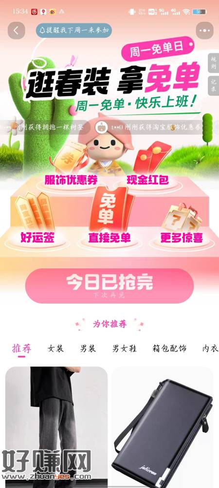淘宝搜索“周一免单”->每周一有3次机会抽免单。