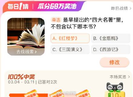 手淘搜【淘宝大赢家】答案【A 】次日8点后开小红包
