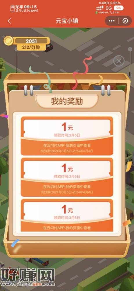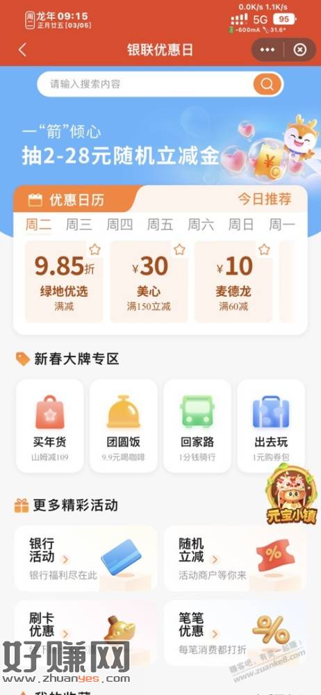 ysf打开搜索“银联优惠日”,进去后右边“元宝小镇”进去做做任务抽奖,ps:把所有类型建筑造一个