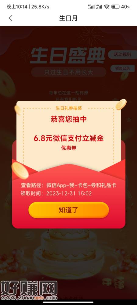 南京银行APP,更新最新版本,这个月生日的,我的,有个弹窗,选择中间位置,我拿了6.8立减金