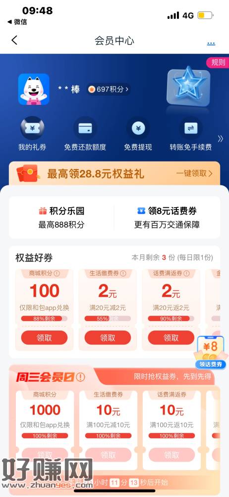 和包会员日抢积分,上面有100不知道你们领没领,我刚领