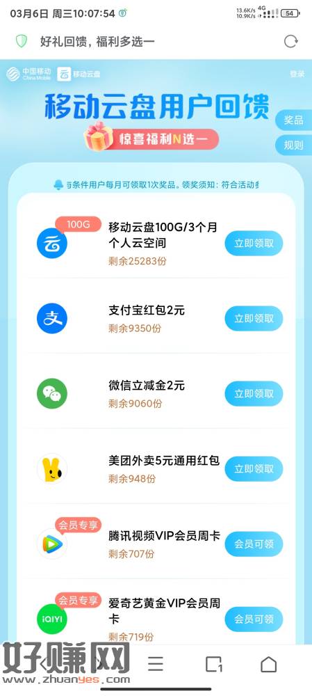 移动 目前都有1亓立jj ,每个月领一次 打不开就浏览器