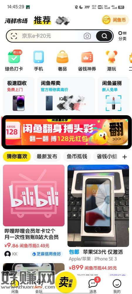 闲鱼首页-翻身进去玩几下-奖励的红包可以买e卡