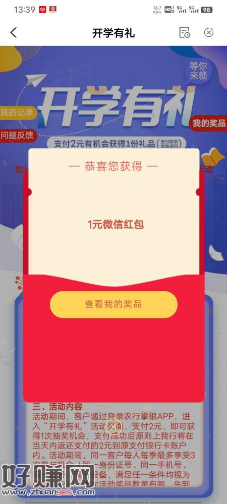 【农行开学有礼抽1-100元微信红包】全国都可以去,部分用户如果提示非受邀就参加不了,点链接跳转到中国农业银行APP活动里(如果点击不跳转,就复制到手机浏览器打开跳转),进去每支付2元可以抽奖1次(支付的钱会原路退回),每个人可以抽3次,刚中1元:
