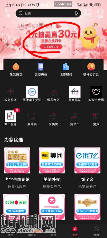 中行-生活-左上角改上海-横幅活动 刚中优酷会员 可代充卖掉 看脸 有概率中优惠券反撸