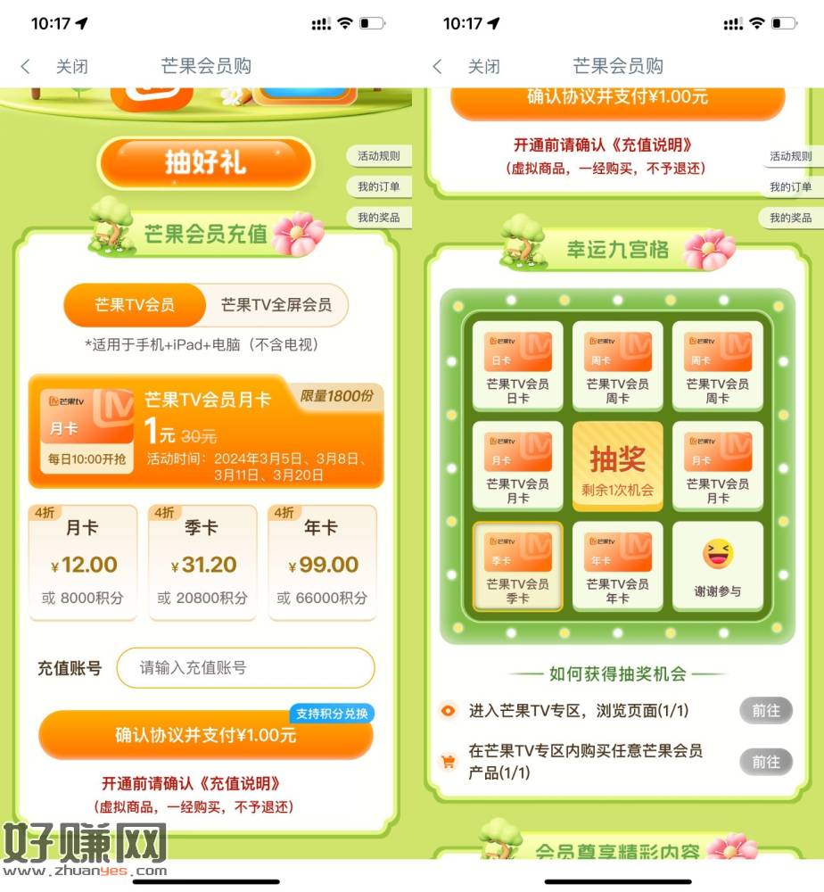【工行抽芒果TV会员7~365天】新一期,10点开始!工行APP搜索“芒果”->3月5日/8日/11日/20日可1亓买芒果TV月卡->下拉有1次机会直接抽周卡月卡等奖励