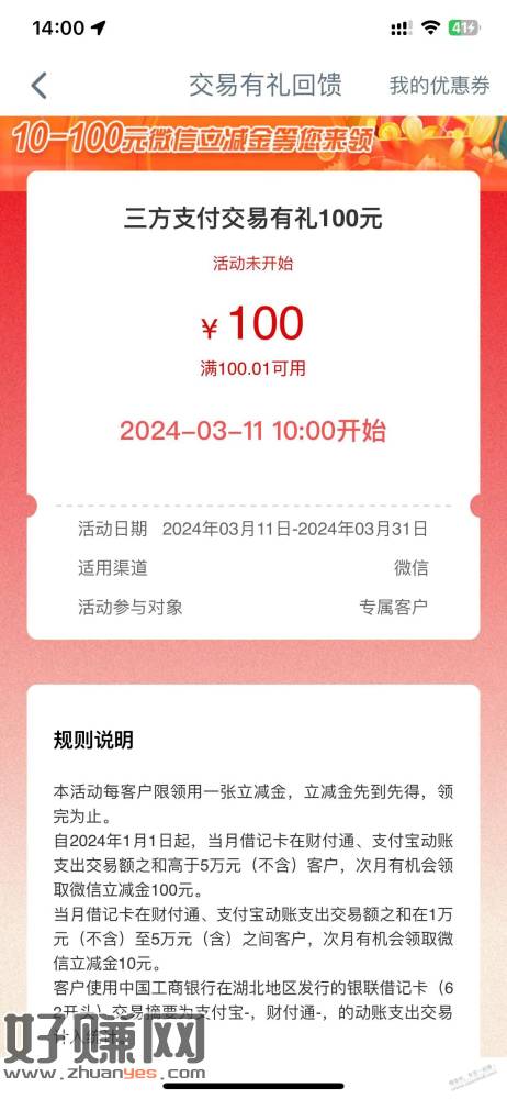 湖北工行消费达标3月11日可领取立减金,最高100元,数量有限先到先得。