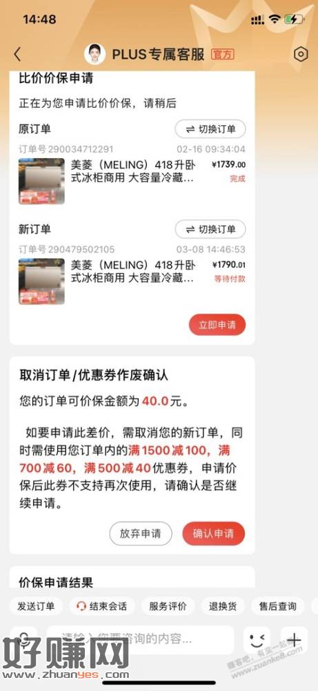 Plus领500-40最近买500以上可以去保价了,保价不成功直接人工客服,成功保价40