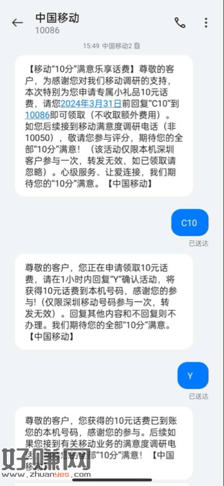深圳移动手机号码发送C10到10086得10元话费,仅限深圳