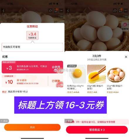 【淘宝生鲜补贴3元撸8个鲜鸡蛋】淘宝打开活动->标题上方自动领16-3亓券->直接点“3元3件”付3r就行了