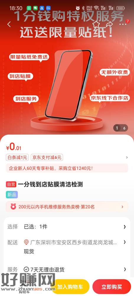 JD一分钱手机贴膜 [ 京东 ]「[ 京东自营 ]一分钱到店贴膜清洁