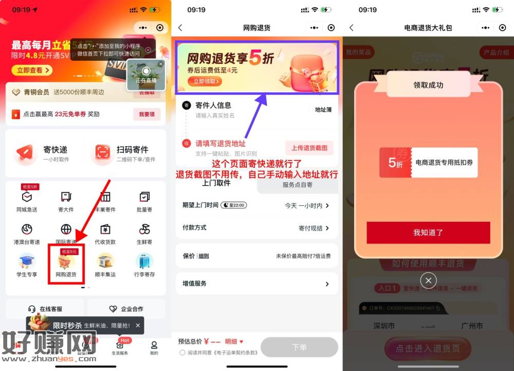 【顺丰快递直接领取5折寄件券】微信进入小程序“顺丰速运+”->网购退货->点顶部横幅进入领5折券->在当前页面寄快递就行了,最高抵扣15亓