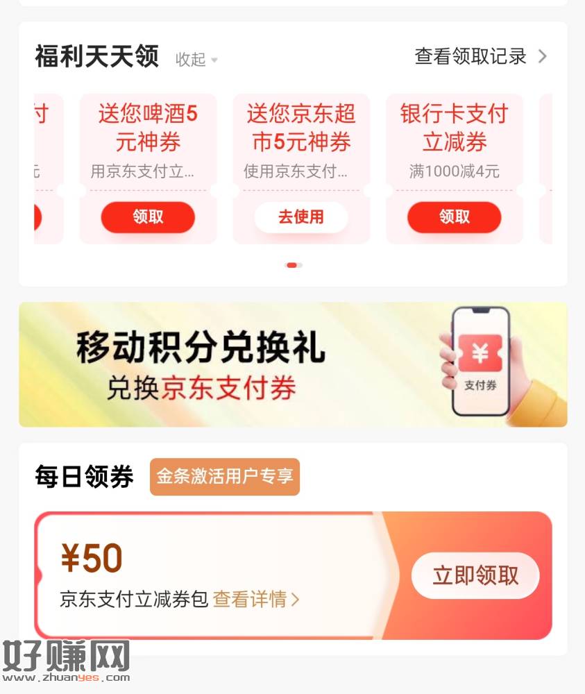 京东我的—我的钱包-福利天天领-领6-5超市支付卷