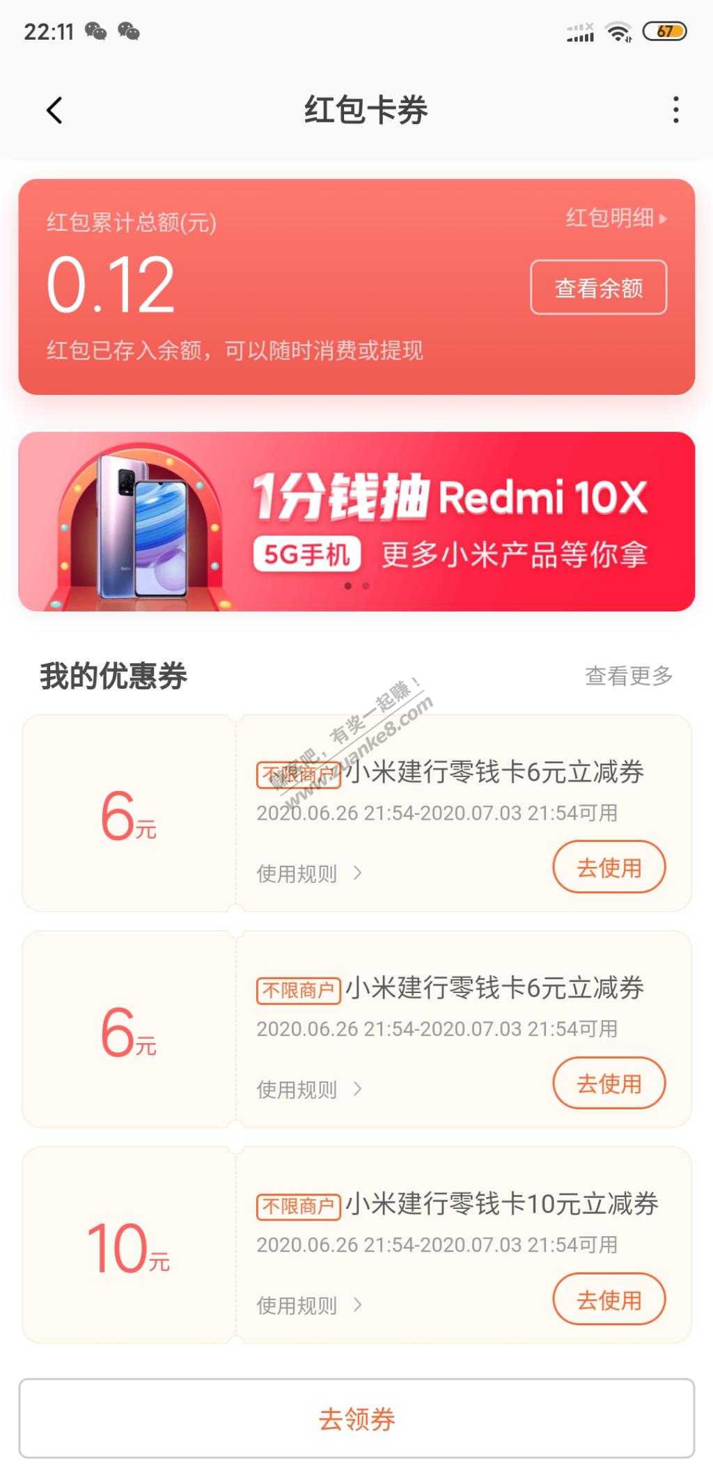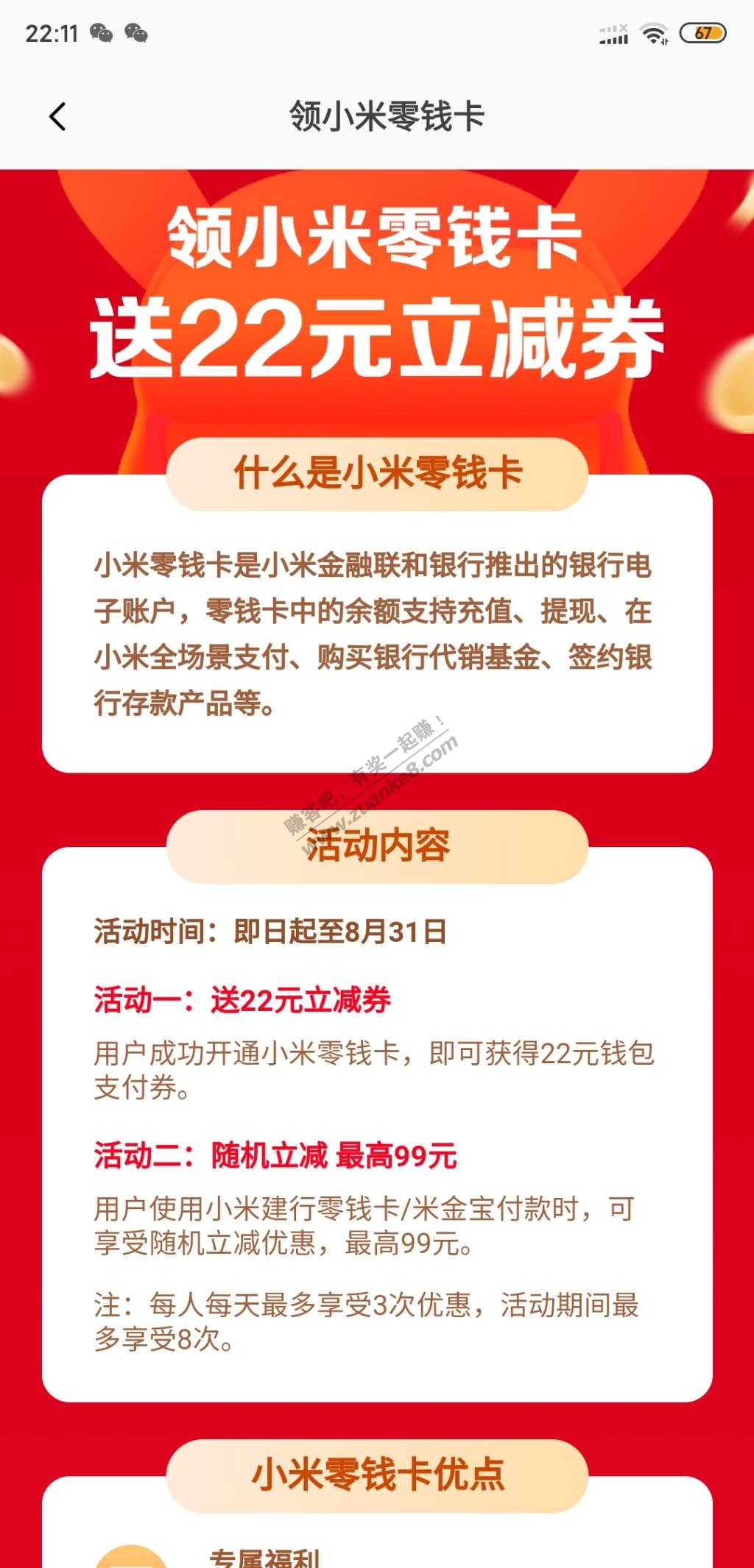 小米钱包,主页广告开户立得22元立减券,进去开小米零钱卡,送的22可电费可话费