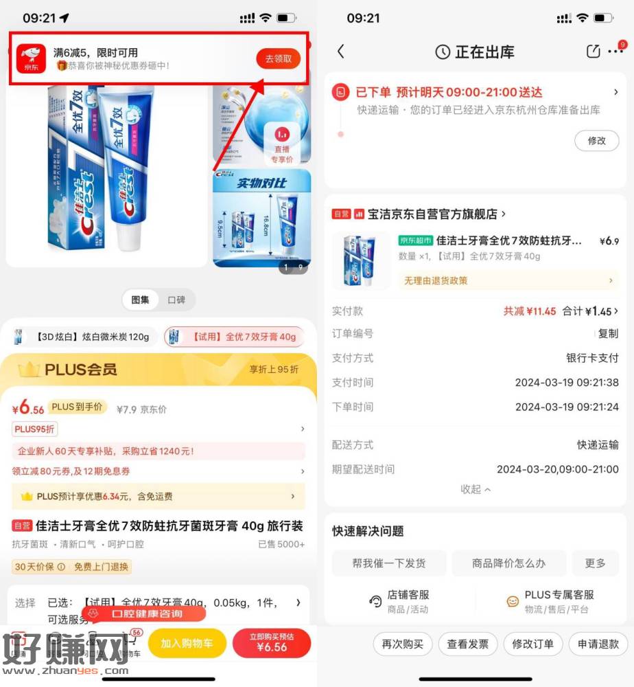 浏览器打开跳转京东APP->顶部弹出6减5亓券->京东PLUS会员1.47亓到手牙膏