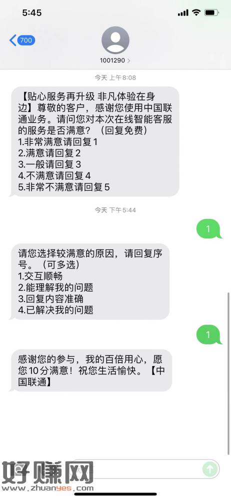 4:第二天上午会收到回访短信,回复短信里【非常满意]前的数字,例如“1”即可完成