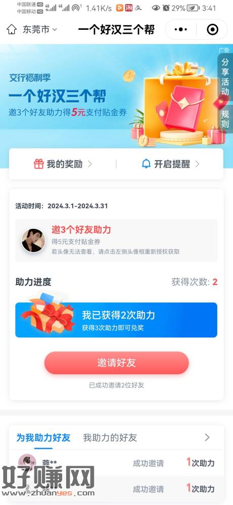 交通银行小程序,一个好汉三个帮,邀请三个小号5津贴