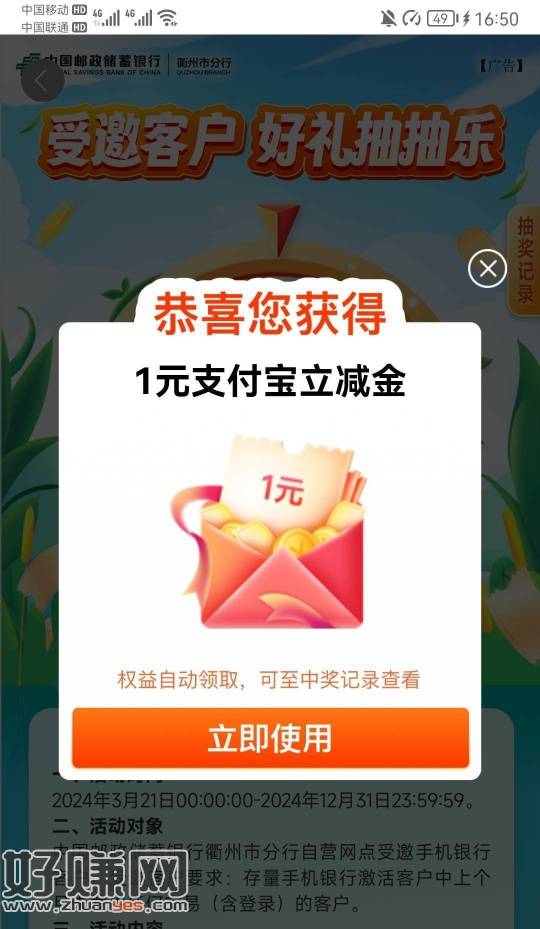 邮储浙江衢州活动专区受邀客户好礼抽抽乐,