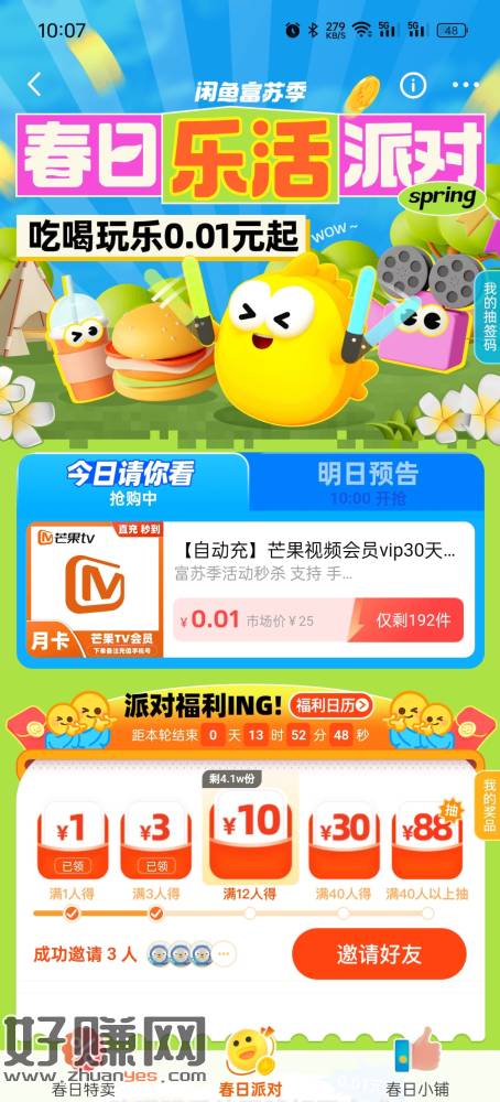 闲鱼嗖复苏季 有一分钱的芒果月卡 可自用可代充