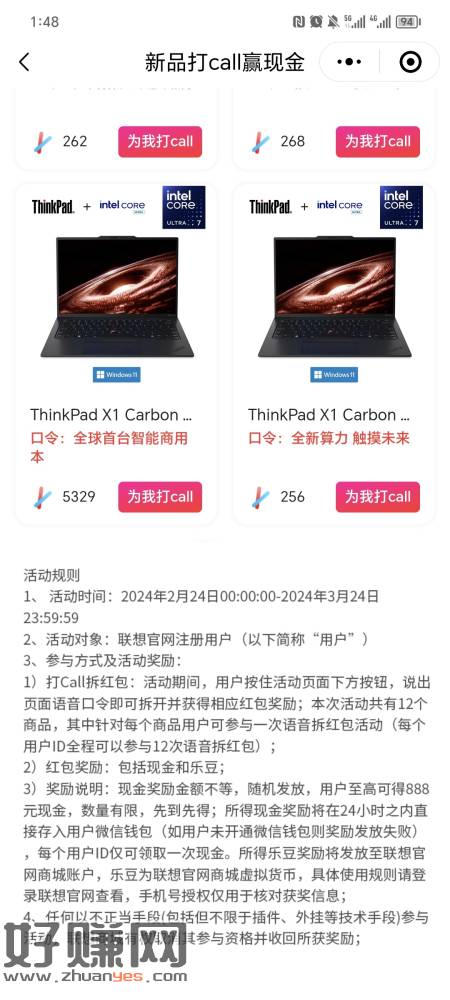 微信小程序联想商中间打call领现金,刚中一元 ,可多号